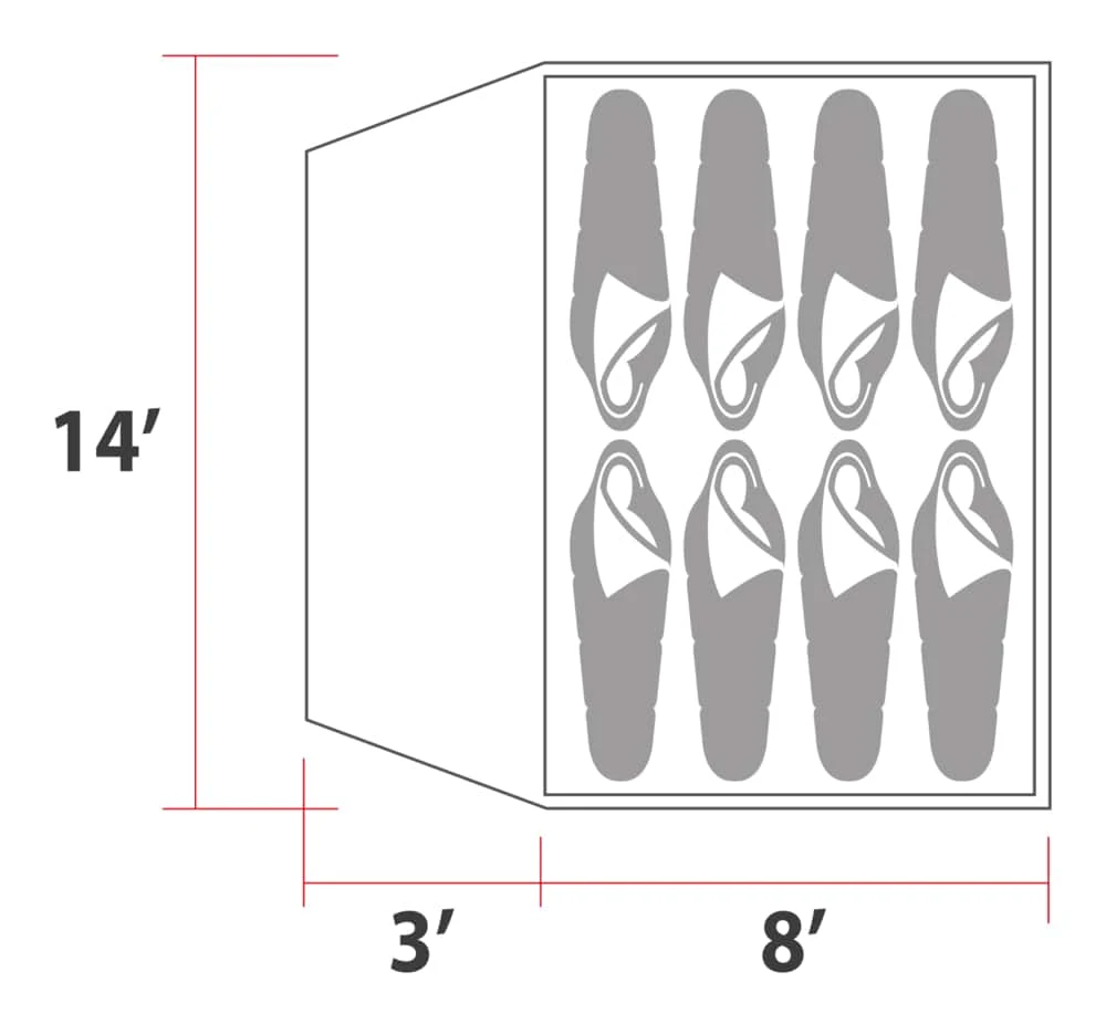 - Tent dimensions: 14′ x 8′ x 6’6″ (4.2 m x 2.4 m x 1.9 m)