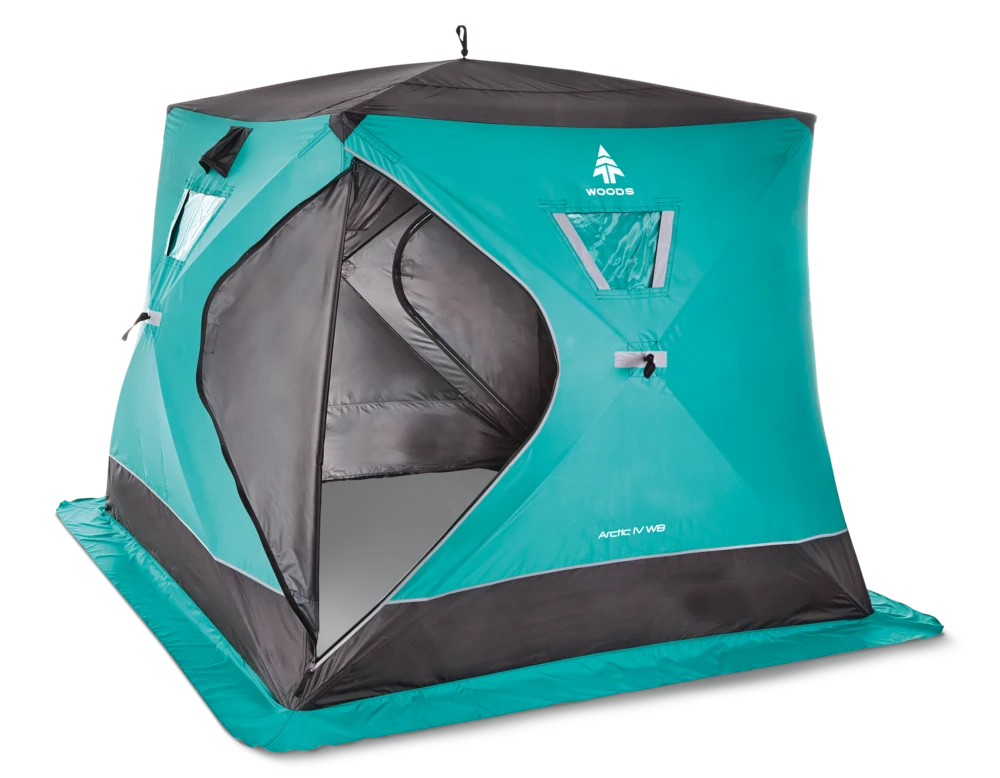 - Woods Arctic Ice Shelter covers extended ground with the extra long skirt to keep the elements outside