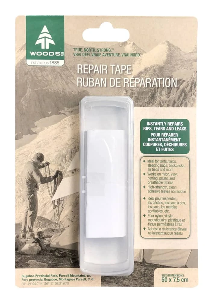 - Woods Repair Tape repairs tents, tarps, mosquito netting, raingear, backpacks, sleeping bags, pads, seat cushions, boat covers and more!